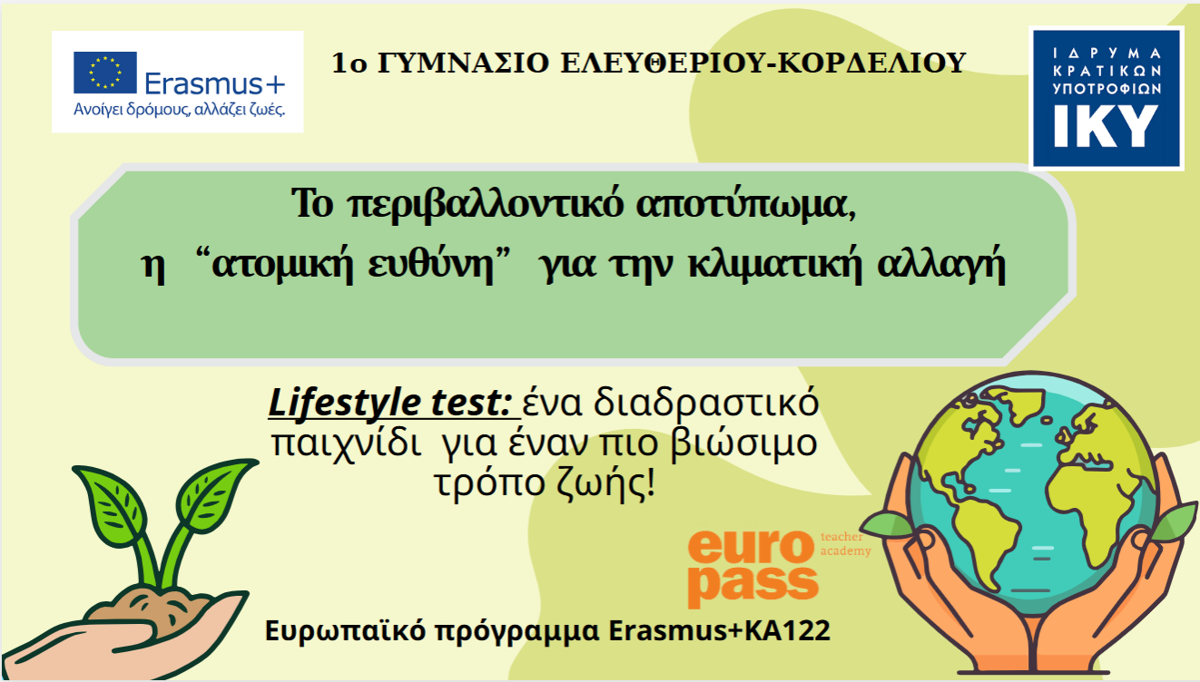 Πατώντας πάνω στον παρακάτω σύνδεσμο θα μεταφερθείτε στην παρουσίαση για το περιβαλλοντικό αποτύπωμα,την "ατομική μας ευθύνη" για την κλιματική αλλαγή και ένα διαδραστικό παιχνίδι για έναν πιο βιώσιμο τρόπο ζωής (lifestyle test), που δημιουργήθηκε στα πλαίσια της διάχυσης των αποτελεσμάτων του ευρωπαϊκού προγράμματος Erasmus + KA122 "Εκπαιδεύοντας τους αυριανούς πολίτες σε ένα αειφόρο σχολείο με έμφαση στο περιβάλλον και στην απόκτηση δεξιοτήτων" και ειδικότερα του επιμορφωτικού σεμιναρίου "Environmental Education: Learning and Acting for a Better Future"