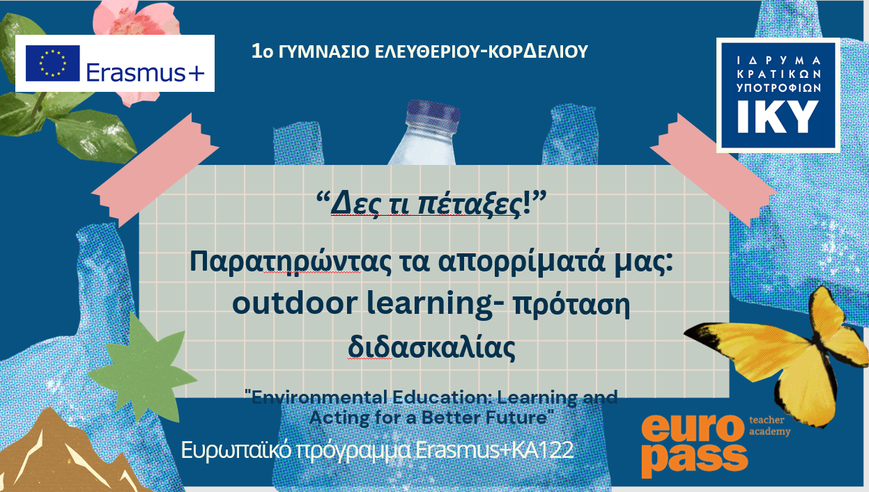 Πατώντας πάνω στον παρακάτω σύνδεσμο θα μεταφερθείτε στην παρουσίαση "Δες τι πέταξες!" Παρατηρώντας τα απορρίματά μας: outdoor learning- πρόταση διδασκαλίας , που δημιουργήθηκε στα πλαίσια της διάχυσης των αποτελεσμάτων του ευρωπαϊκού προγράμματος Erasmus + KA122 "Εκπαιδεύοντας τους αυριανούς πολίτες σε ένα αειφόρο σχολείο με έμφαση στο περιβάλλον και στην απόκτηση δεξιοτήτων" και ειδικότερα του επιμορφωτικού σεμιναρίου "Environmental Education: Learning and Acting for a Better Future"