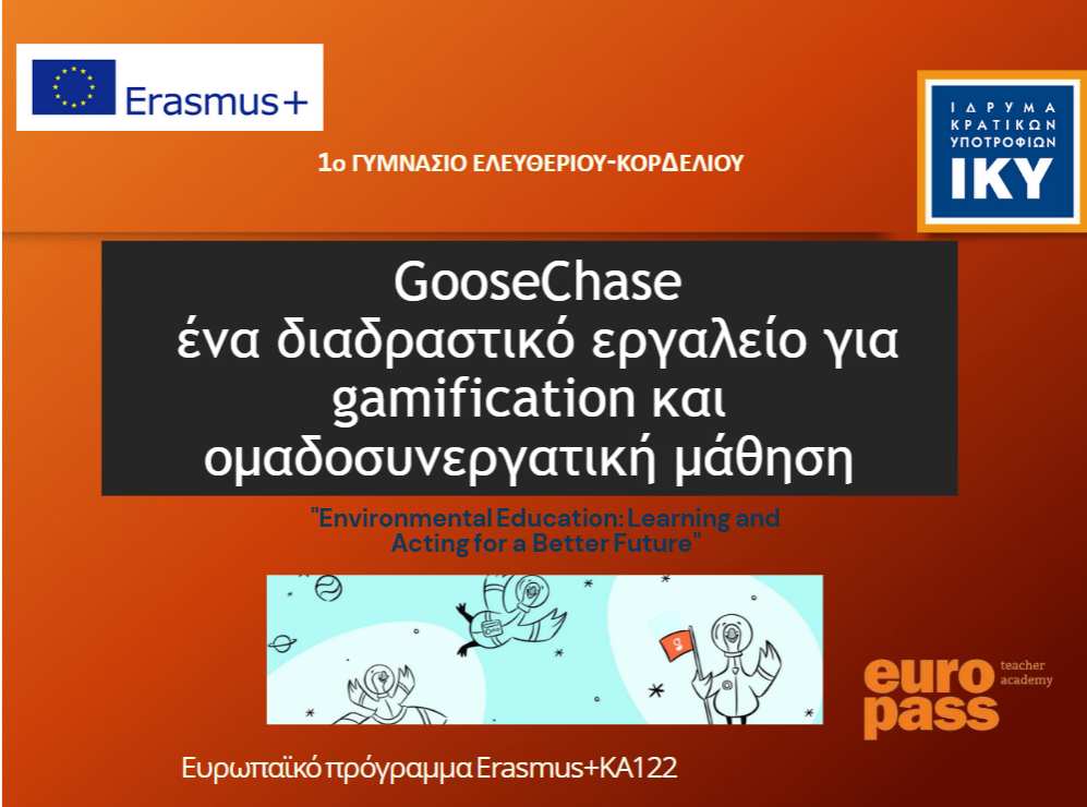 Πατώντας πάνω στον παρακάτω σύνδεσμο θα μεταφερθείτε στην παρουσίαση για το GooseChase ένα διαδραστικό εργαλείο για gamification και ομαδοσυνεργατική μάθηση , που δημιουργήθηκε στα πλαίσια της διάχυσης των αποτελεσμάτων του ευρωπαϊκού προγράμματος Erasmus + KA122 "Εκπαιδεύοντας τους αυριανούς πολίτες σε ένα αειφόρο σχολείο με έμφαση στο περιβάλλον και στην απόκτηση δεξιοτήτων" και ειδικότερα του επιμορφωτικού σεμιναρίου "Environmental Education: Learning and Acting for a Better Future"